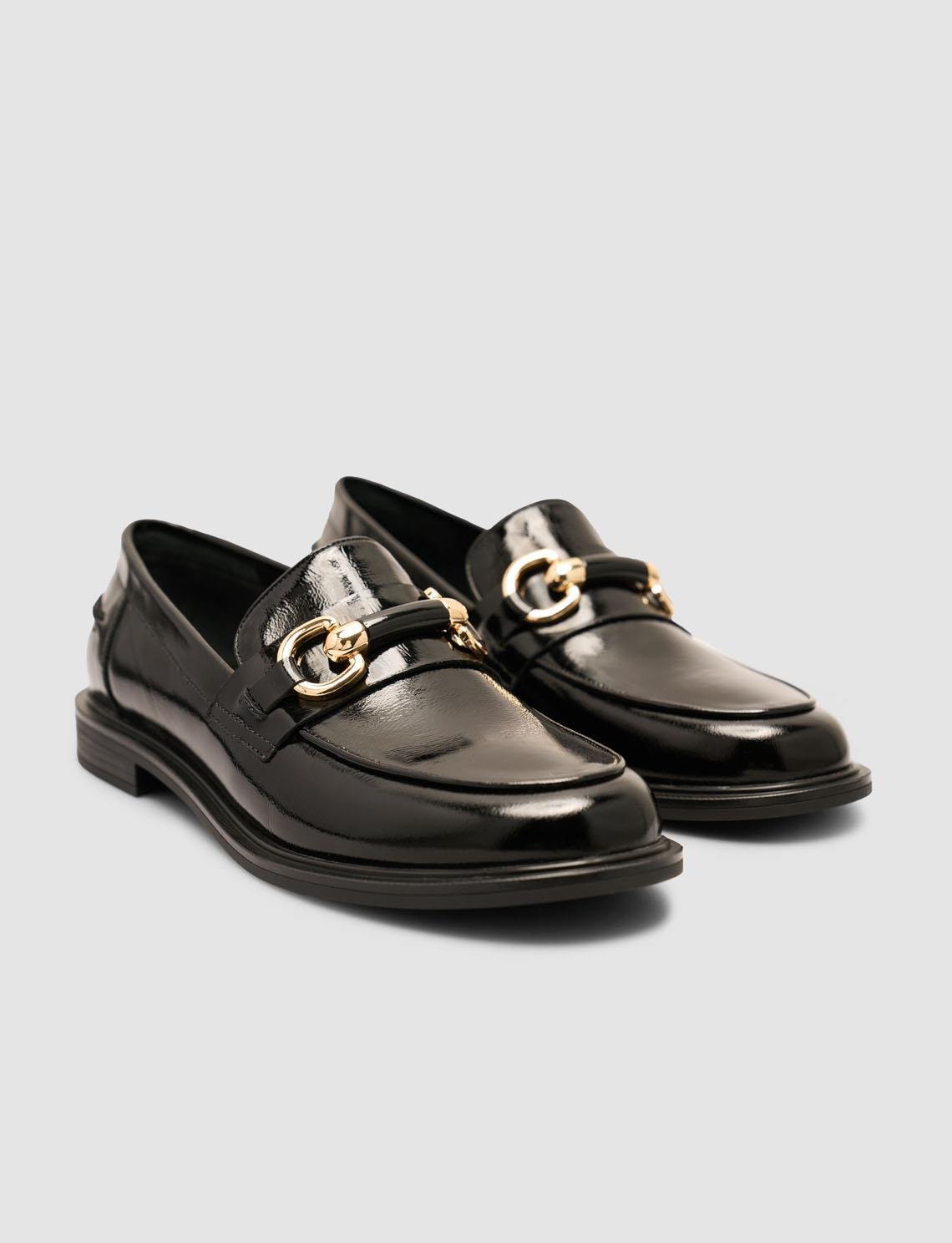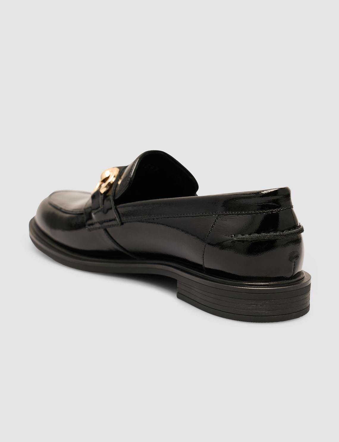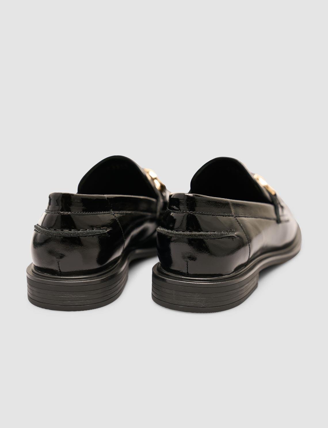 Zarif tokalı detayı ve parlak rugan görünümüyle öne çıkan bu siyah kadın loafer ayakkabı, kış sezonunda şıklığı modern bir yorumla sunar. Hakiki dana derisi dış yüzeyi, pürüzsüz dokusu ve göz alıcı parlaklığıyla hem klasik hem de şehir stiline uyum sağlar.