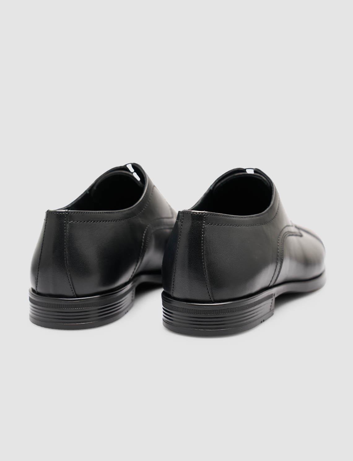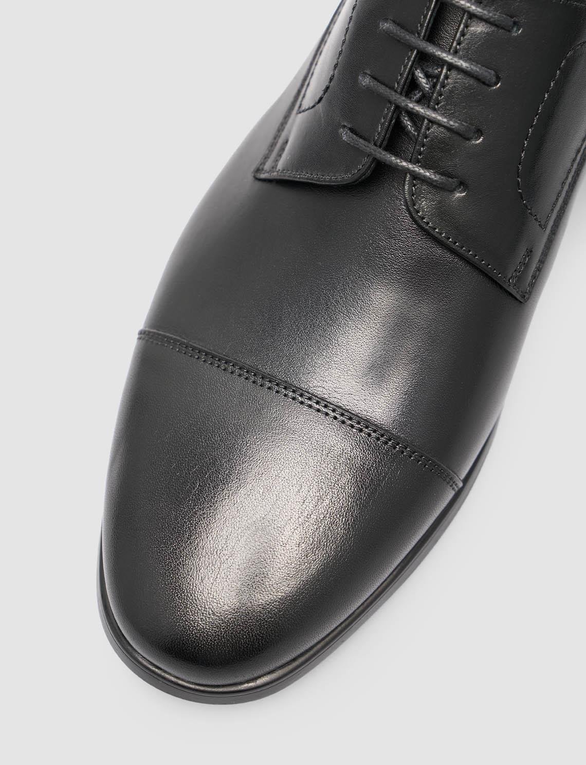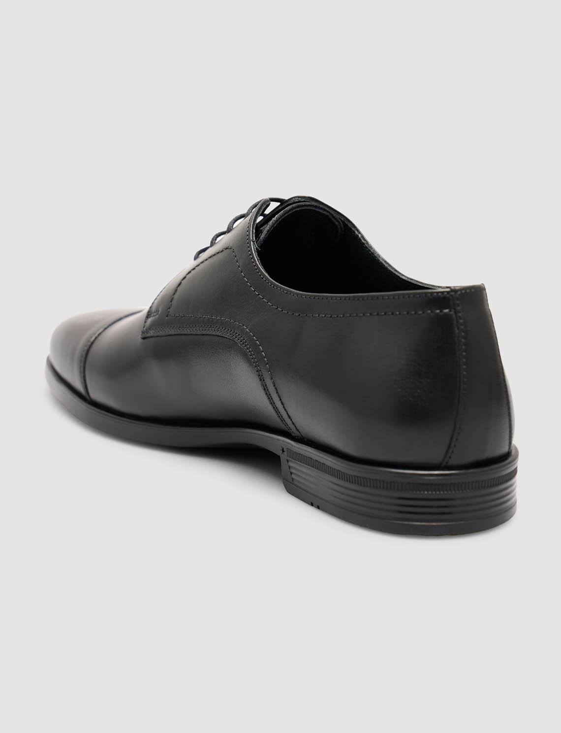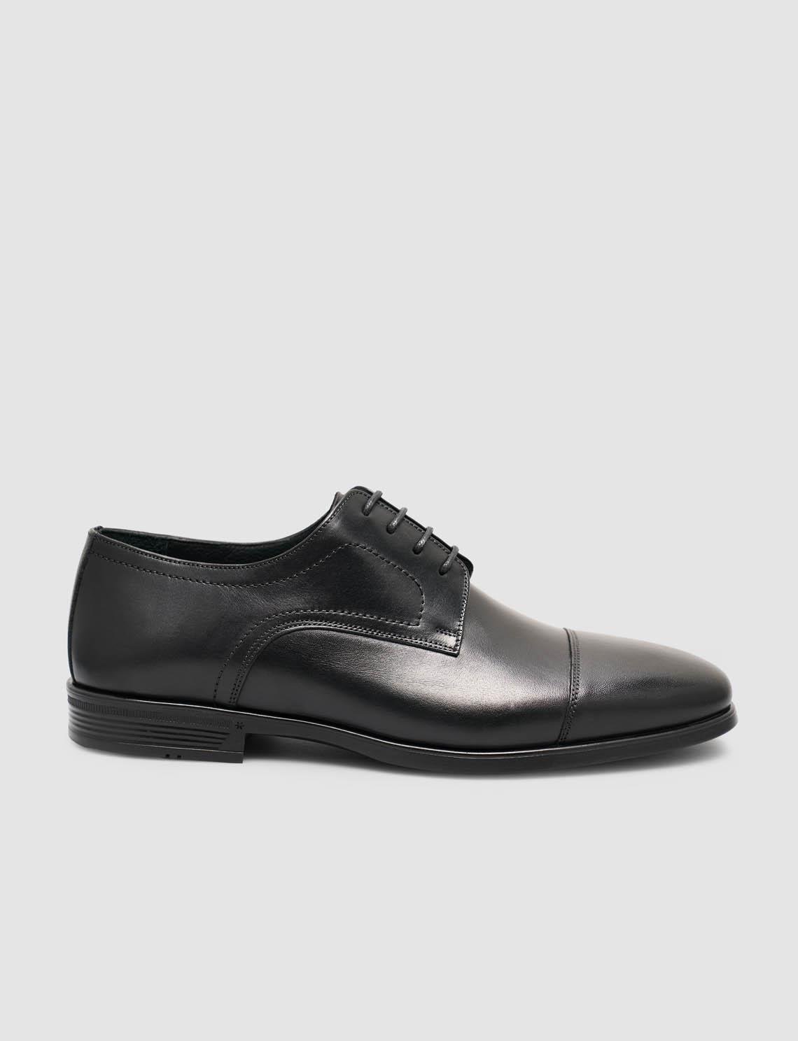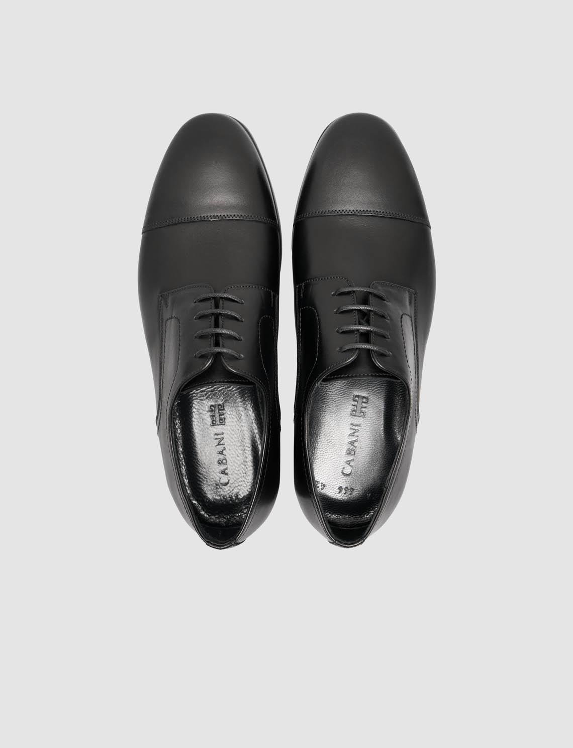 Zamansız şıklığın modern konforla buluştuğu hakiki dana deri siyah klasik ayakkabı, nefes alabilen hakiki keçi derisi iç astarı sayesinde gün boyu ferahlık sunar. Kaymaya dayanıklı kauçuk tabanı ve 2,5 cm taban yüksekliği, yumuşak adım hissi sağlayarak hem ofiste hem özel günlerde rahat kullanım imkânı verir. Normal kalıba sahip bağcıklı tasarımı, mevsimlik kullanım için ideal olup sade, zarif ve profesyonel bir görünüm arayanlar için kusursuz bir seçenektir.