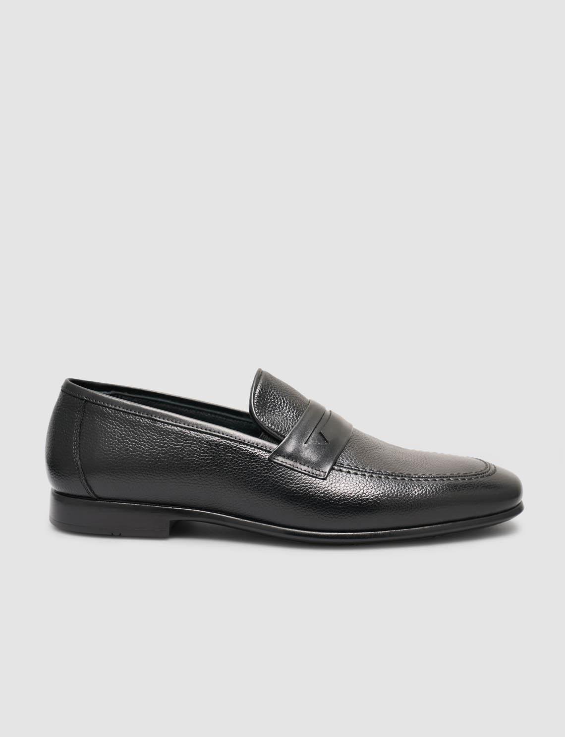 Zarif dokulu hakiki dana derisiyle üretilen bu siyah klasik loafer, nefes alabilen hakiki keçi derisi iç astarı sayesinde gün boyu ferah ve konforlu bir kullanım sunar. Kaymaya dayanıklı kauçuk tabanı ve 2 cm taban yüksekliği, adımlara denge ve yumuşaklık katarken mevsimlik kullanım için ideal bir yapı sağlar. Normal kalıp formu, ayağı sıkmadan doğal uyum sunarken soft yürüyüş özelliği uzun süreli giyimde ekstra rahatlık sağlar. Günlük ve ofis stiline modern ve şık bir dokunuş katan zamansız bir modeldir.