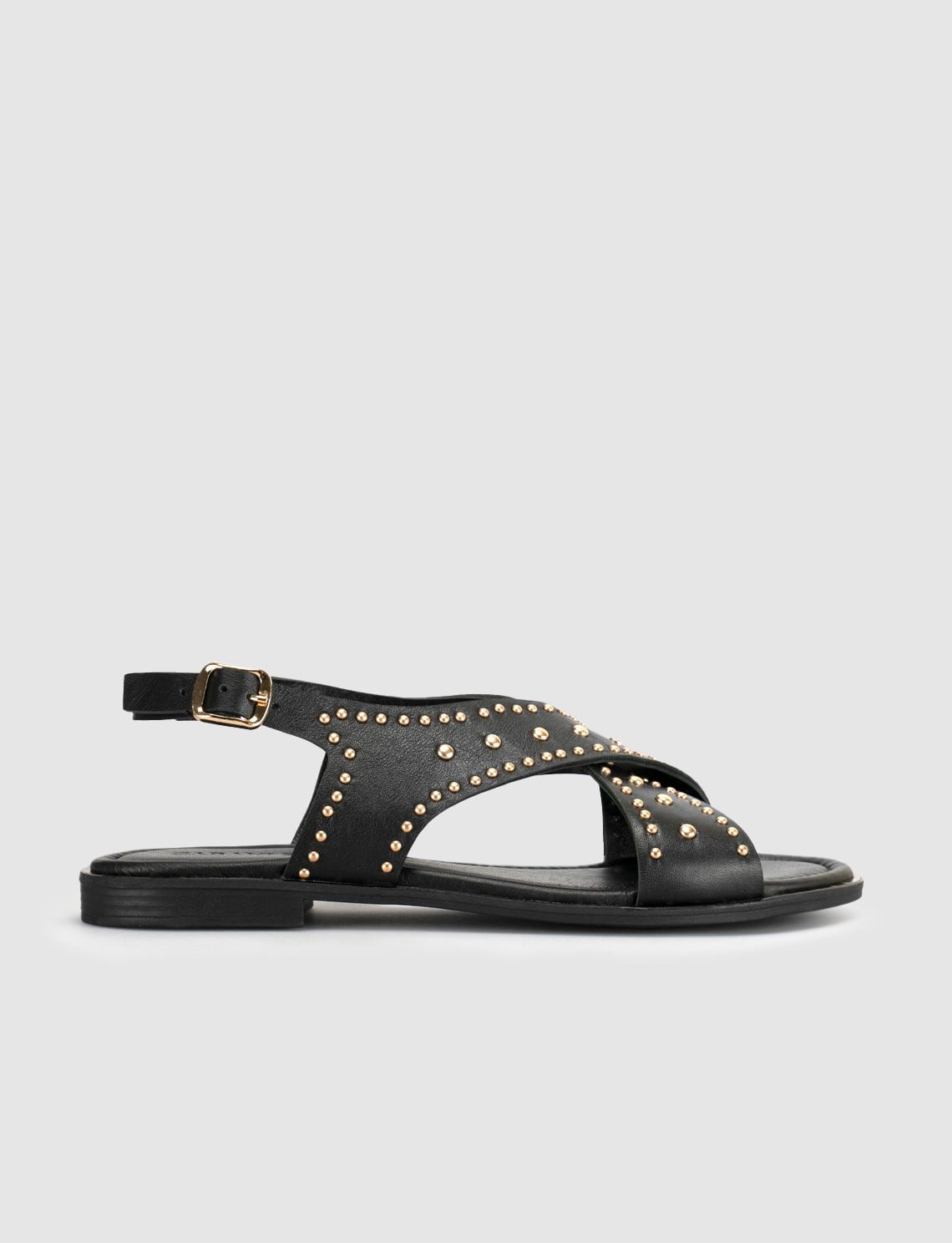 -Modern ve dikkat çekici tasarımıyla öne çıkan bu siyah sandalet, üzerindeki troklu detaylarla stilinize güçlü bir karakter kazandırır.