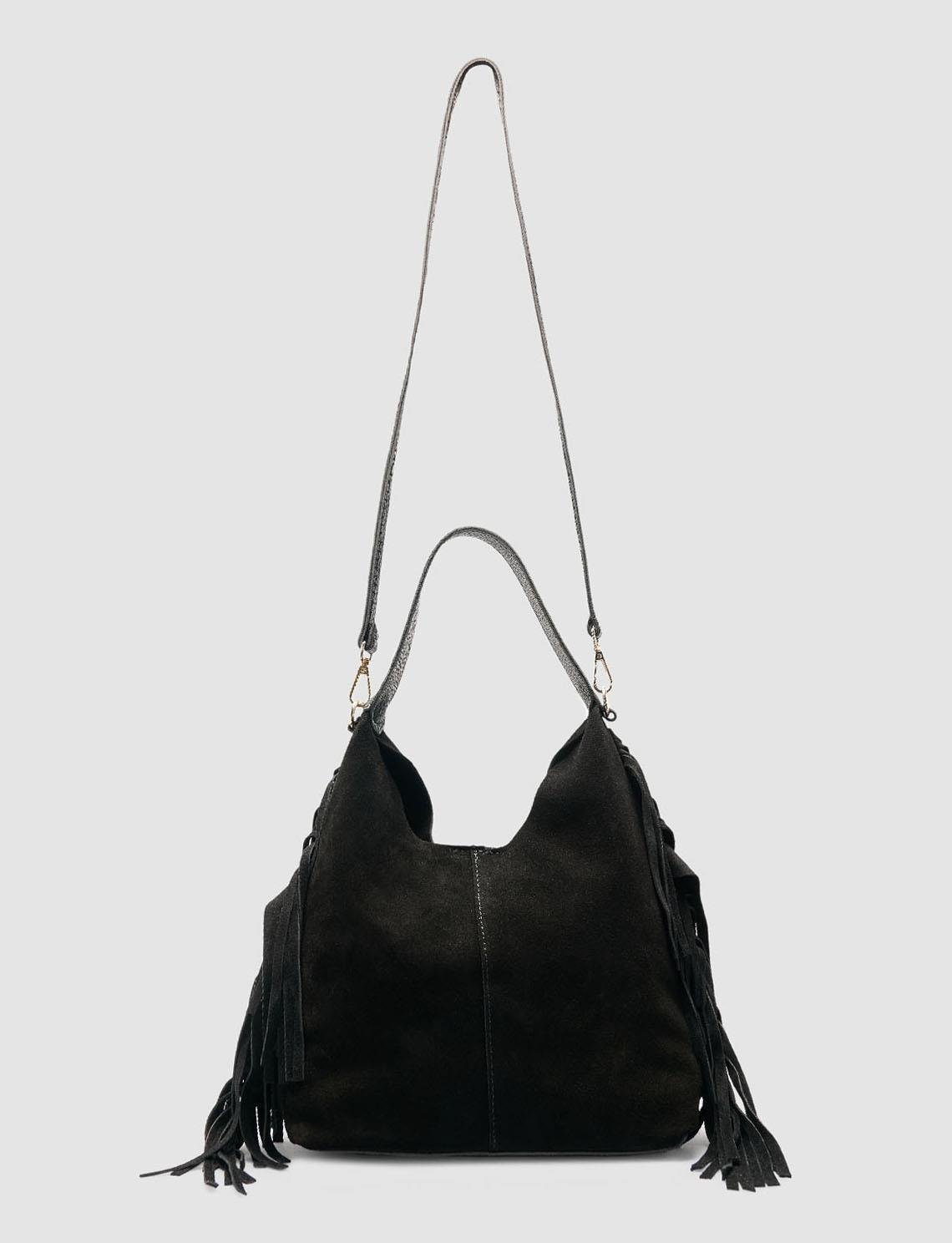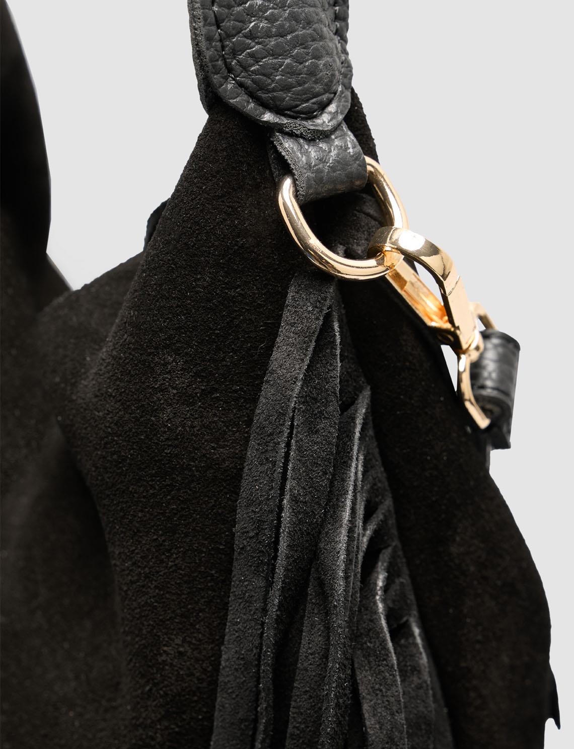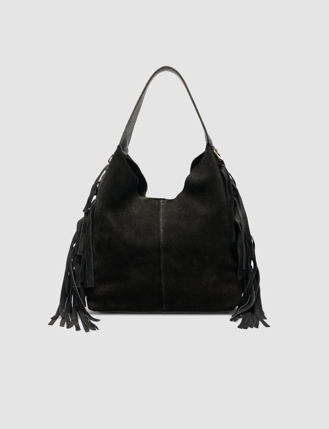 Siyah süet dokusuyla bohem bir stile sahip olan bu omuz çantası, püskül detaylarıyla özgün ve hareketli bir görünüm sunar. Geniş iç hacmi günlük kullanım için ideal olup, yanında gelen çıkarılabilir mini çanta küçük eşyaları düzenli şekilde taşımayı kolaylaştırır. Yumuşak dokulu askısı konforlu bir kullanım sağlarken, altın tonlu metal aksesuarlar modele şık bir dokunuş katar. Günlük şehir stiline, casual kombinlere ve bohem tarzlara kolayca uyum sağlayan kullanışlı ve şık bir çanta modelidir.