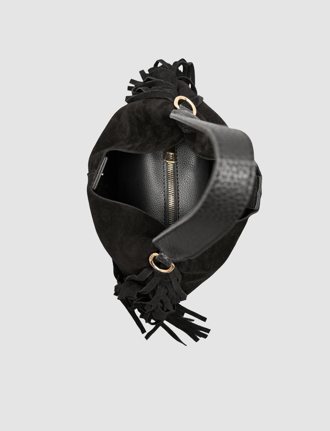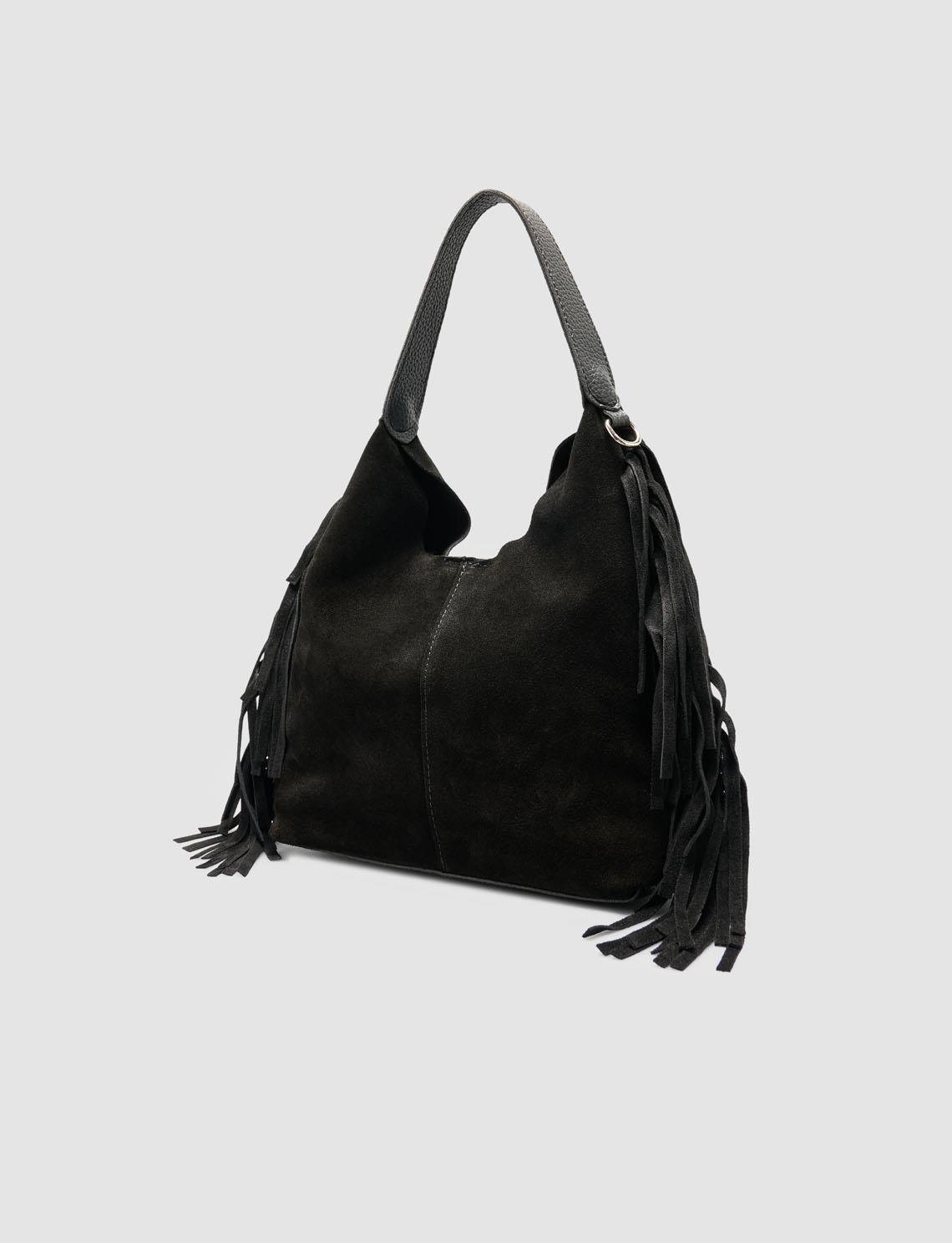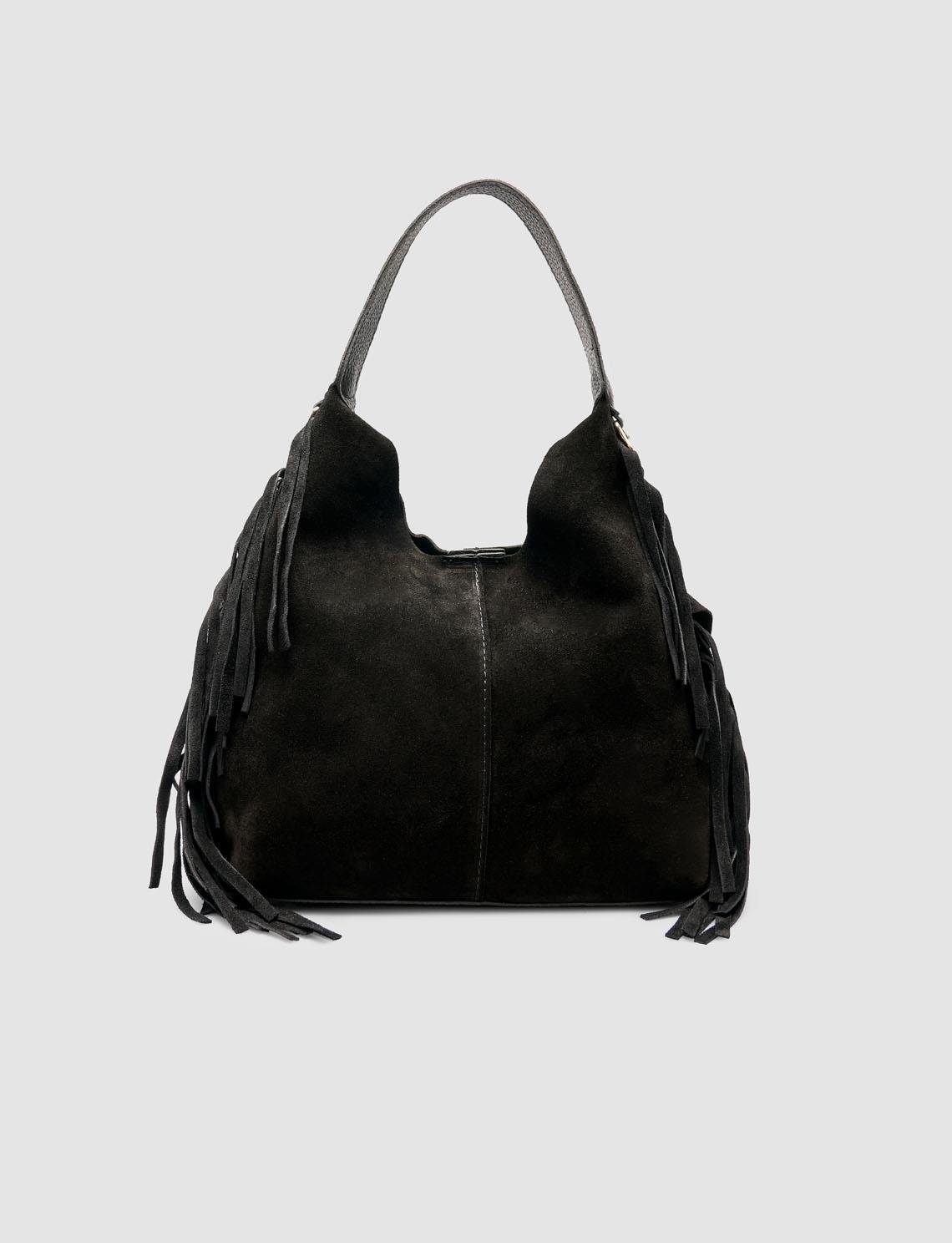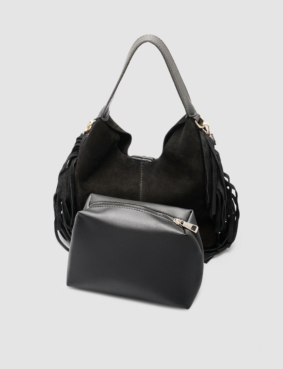 Siyah süet dokusuyla bohem bir stile sahip olan bu omuz çantası, püskül detaylarıyla özgün ve hareketli bir görünüm sunar. Geniş iç hacmi günlük kullanım için ideal olup, yanında gelen çıkarılabilir mini çanta küçük eşyaları düzenli şekilde taşımayı kolaylaştırır. Yumuşak dokulu askısı konforlu bir kullanım sağlarken, altın tonlu metal aksesuarlar modele şık bir dokunuş katar. Günlük şehir stiline, casual kombinlere ve bohem tarzlara kolayca uyum sağlayan kullanışlı ve şık bir çanta modelidir.