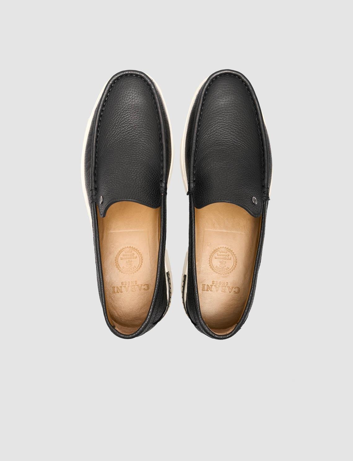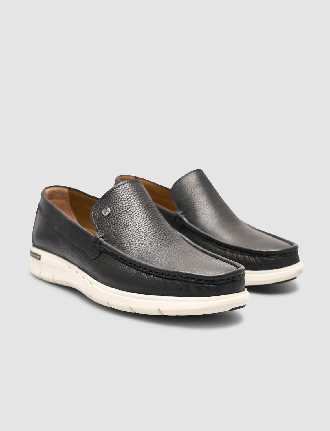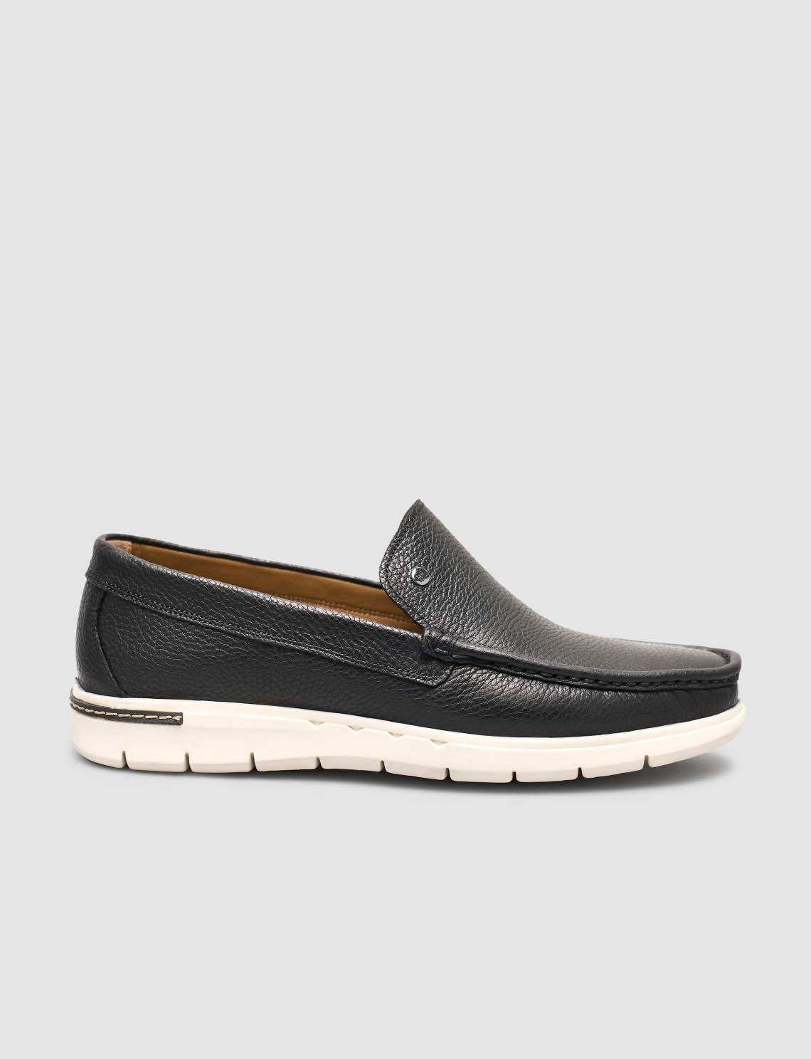 Yumuşak dokulu hakiki dana derisiyle üretilen bu siyah günlük loafer, modern beyaz tabanı ile hem sportif hem şık bir görünüm sunar. Nefes alabilen iç yapısı ve esnek tabanı sayesinde gün boyu konfor sağlayan model, hafifliğiyle uzun süreli kullanımlarda yormaz. Günlük şehir yaşamına, seyahate ve casual kombinlere mükemmel uyum sağlayan bu rahat loafer, mevsimlik yapısıyla her gün kullanıma uygundur.