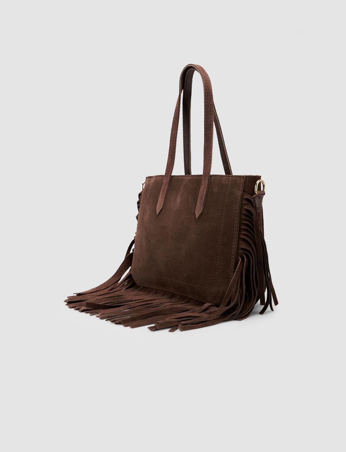 Hakiki Deri Süet Kahverengi Püsküllü Çift Askılı Kadın Omuz Çantası (130032-1113)