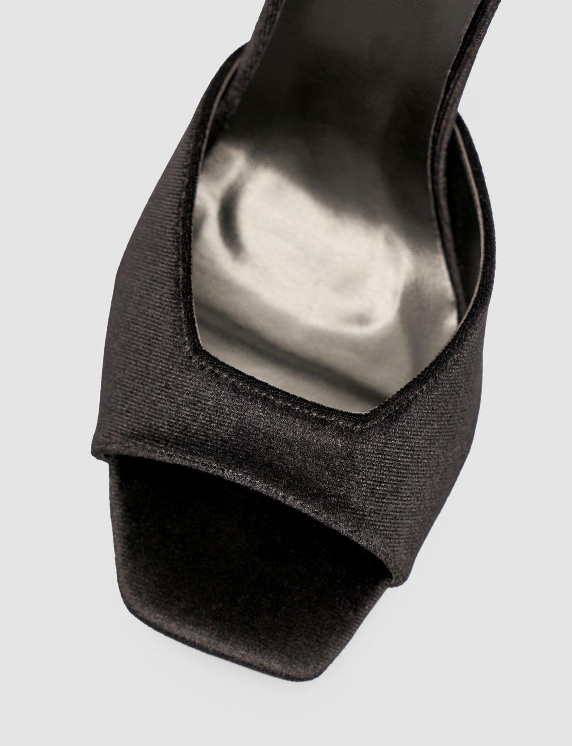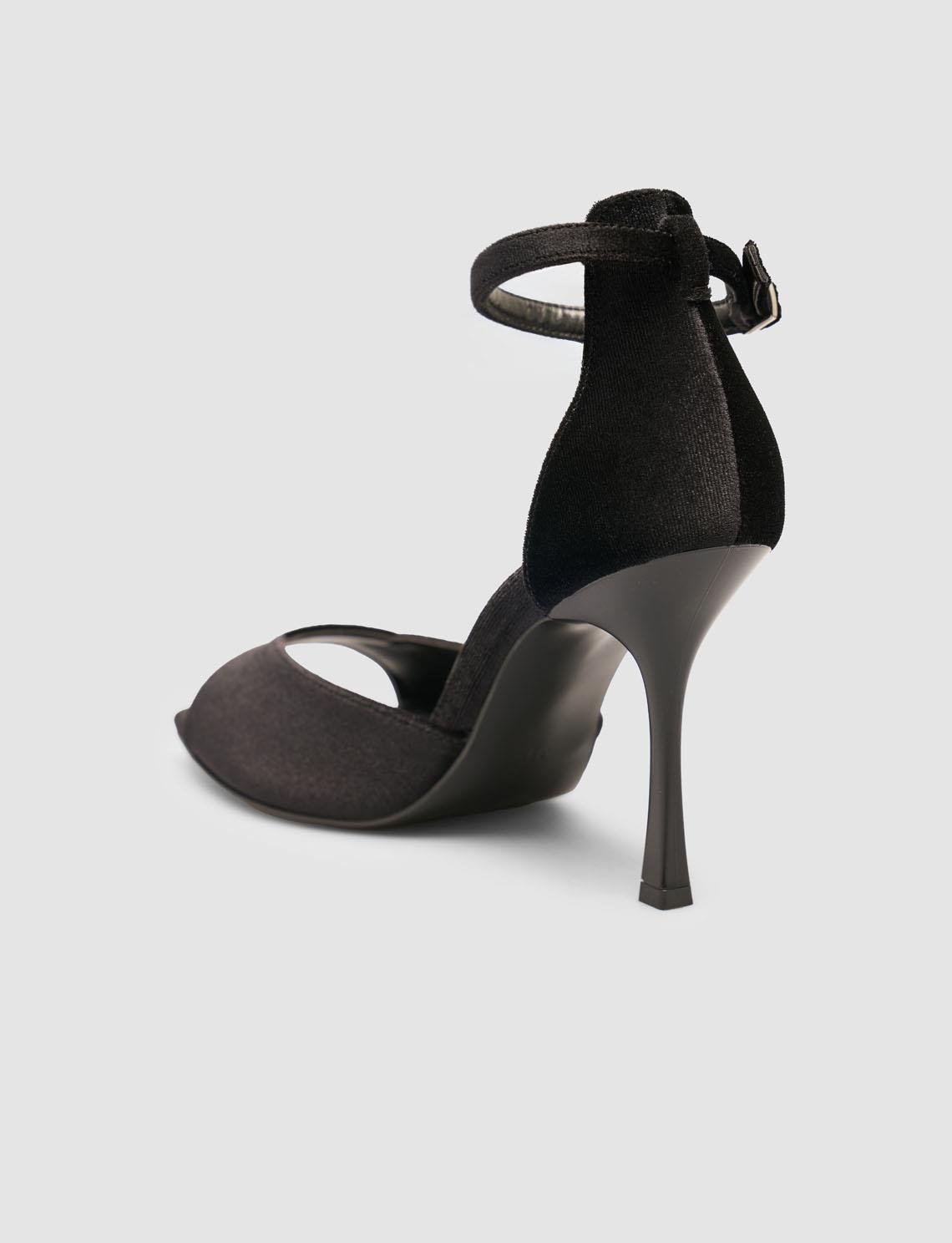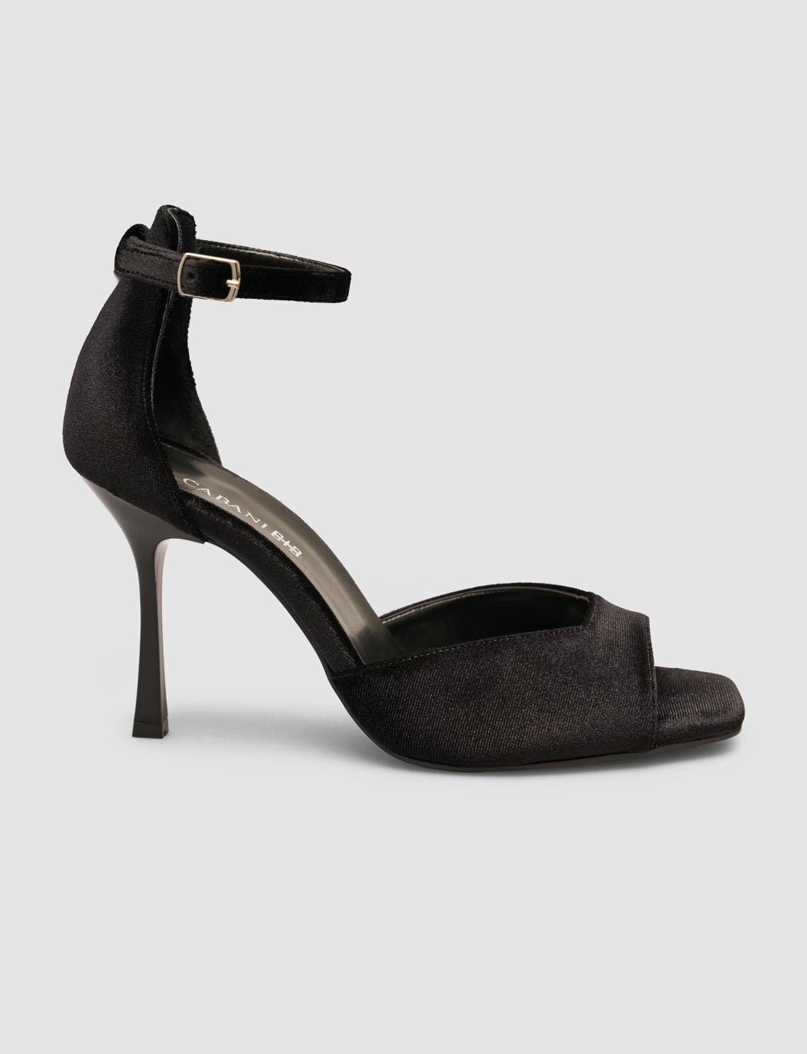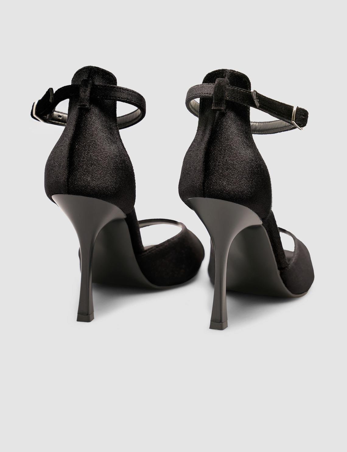 Zarif ve feminen tasarımıyla öne çıkan bu koyu siyah topuklu kadın ayakkabı, özel günlerden şık davetlere kadar geniş bir kullanım alanı sunar. Kadife tekstil dış yüzeyi, yumuşak dokusu ve mat görünümüyle sofistike bir stil yaratır.